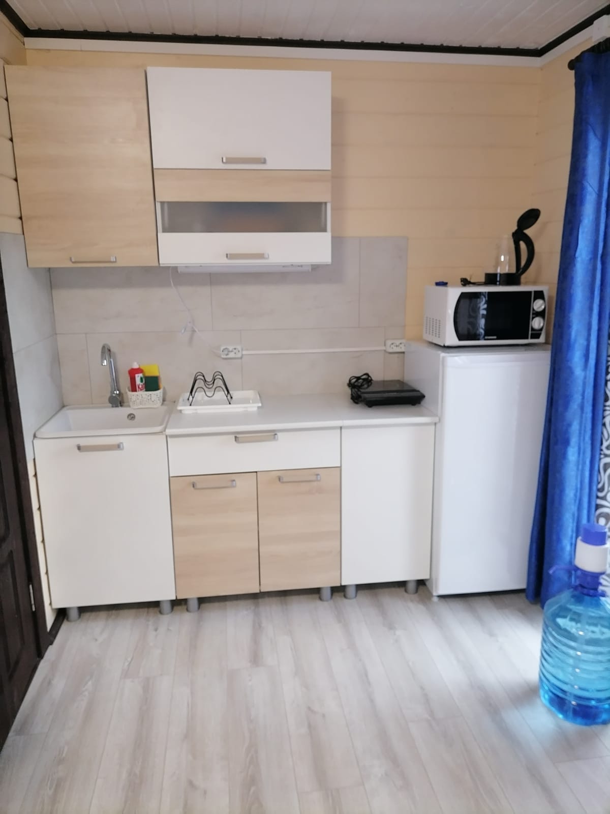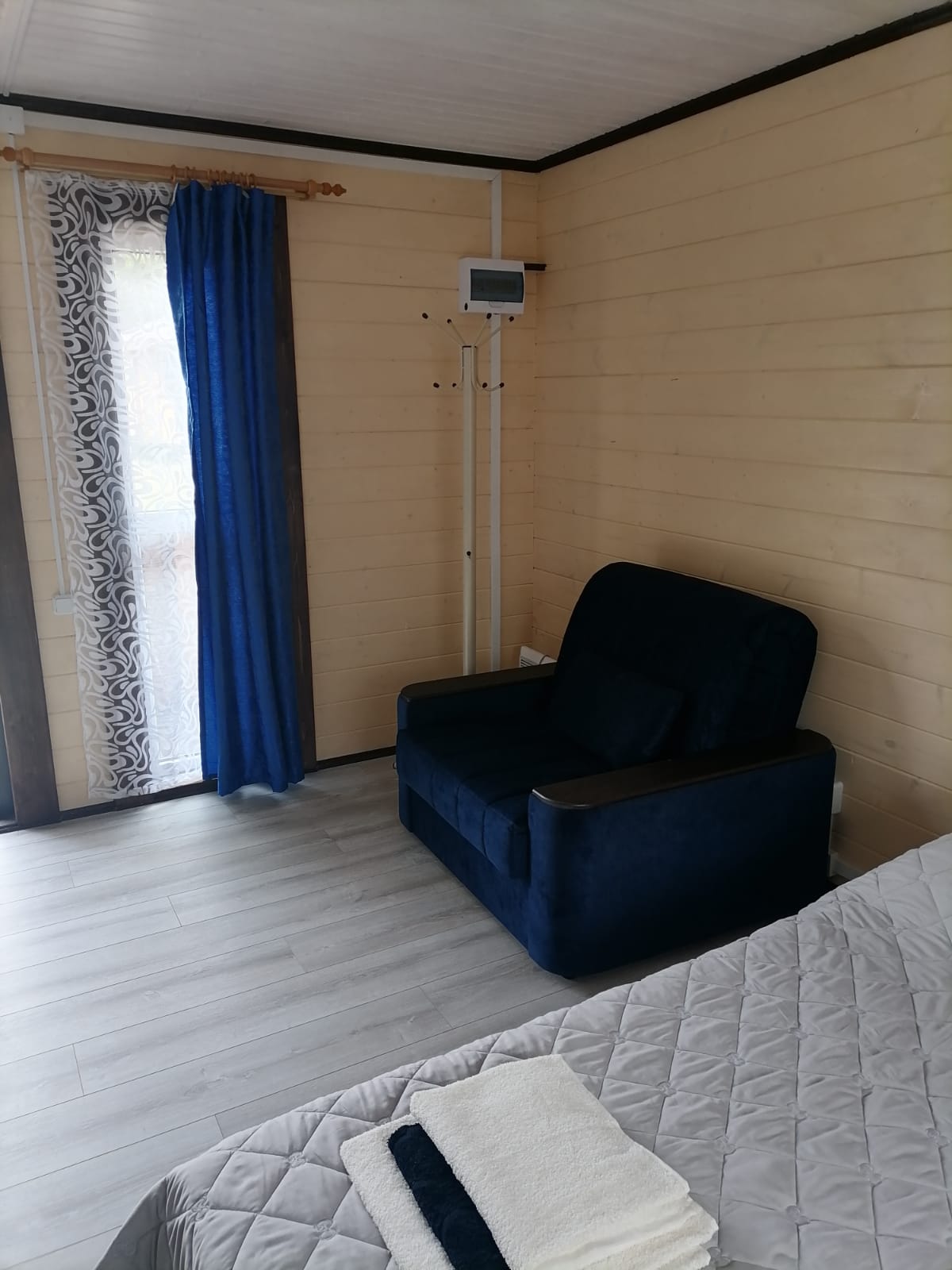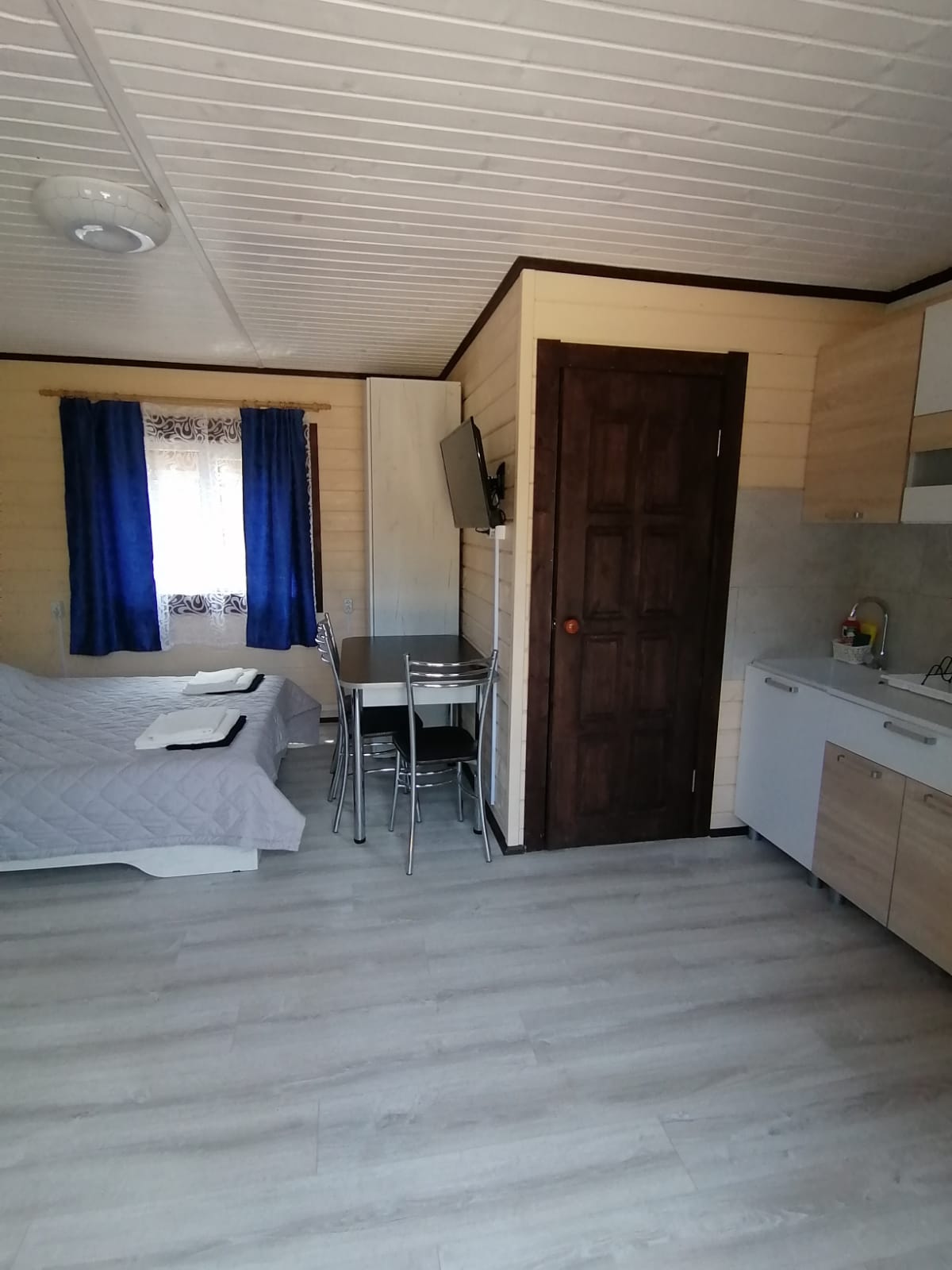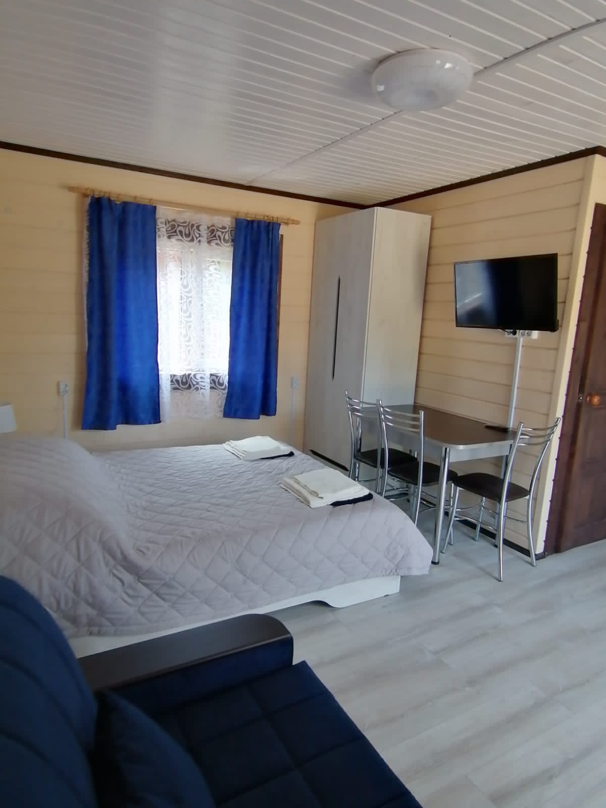 Дом №2. Идеально подойдет молодой паре для спокойного и уютного отдыха. Коттедж рассчитан от 1 до 3 человек. В доме один этаж, расположена комфортная двухспальная кровать и раскладной диван. Мини-кухня со всем необходимым, санузел и душ. Рядом детская и спортивная площадки. В пешей доступности река Ока с песчаным пляжем.
