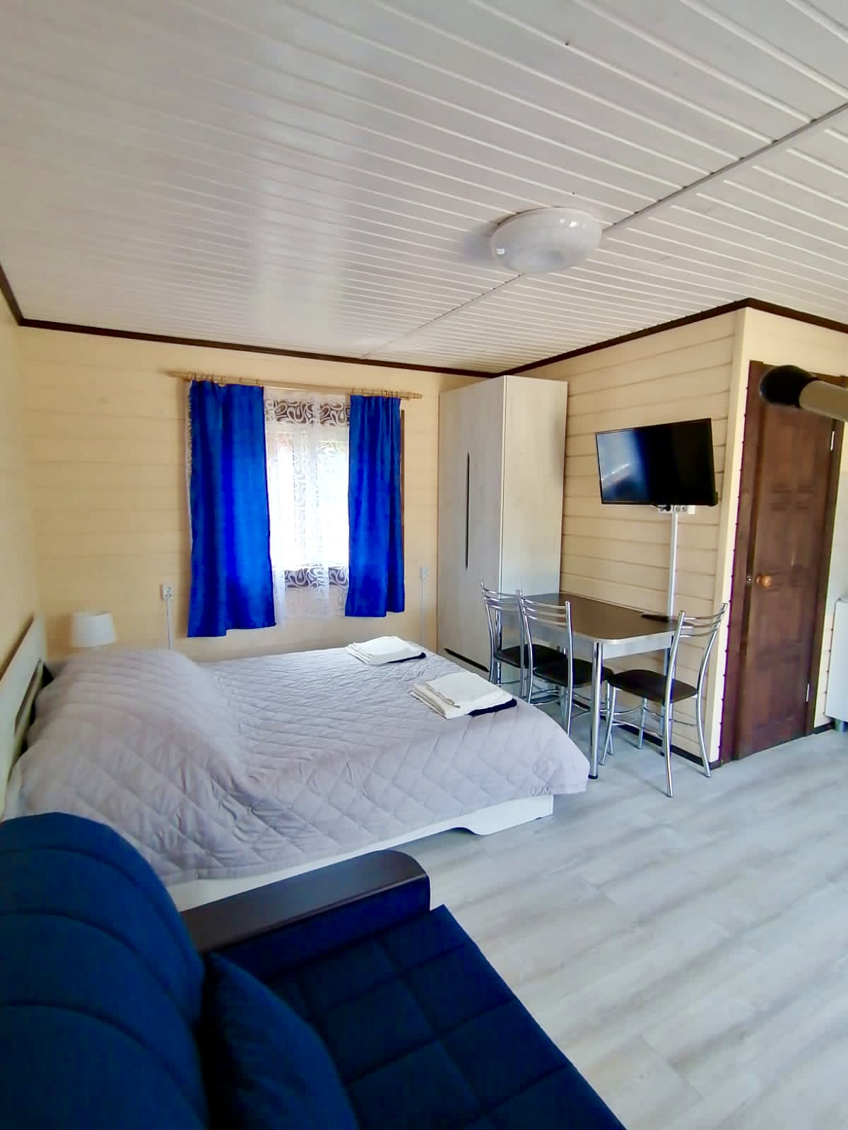 Дом №1. Идеально подойдет молодой паре для спокойного и уютного отдыха. Коттедж рассчитан от 1 до 3 человек. В доме один этаж, расположена комфортная двухспальная кровать и раскладной диван. Мини-кухня со всем необходимым, санузел и душ. Рядом детская и спортивная площадки. В пешей доступности река Ока с песчаным пляжем.